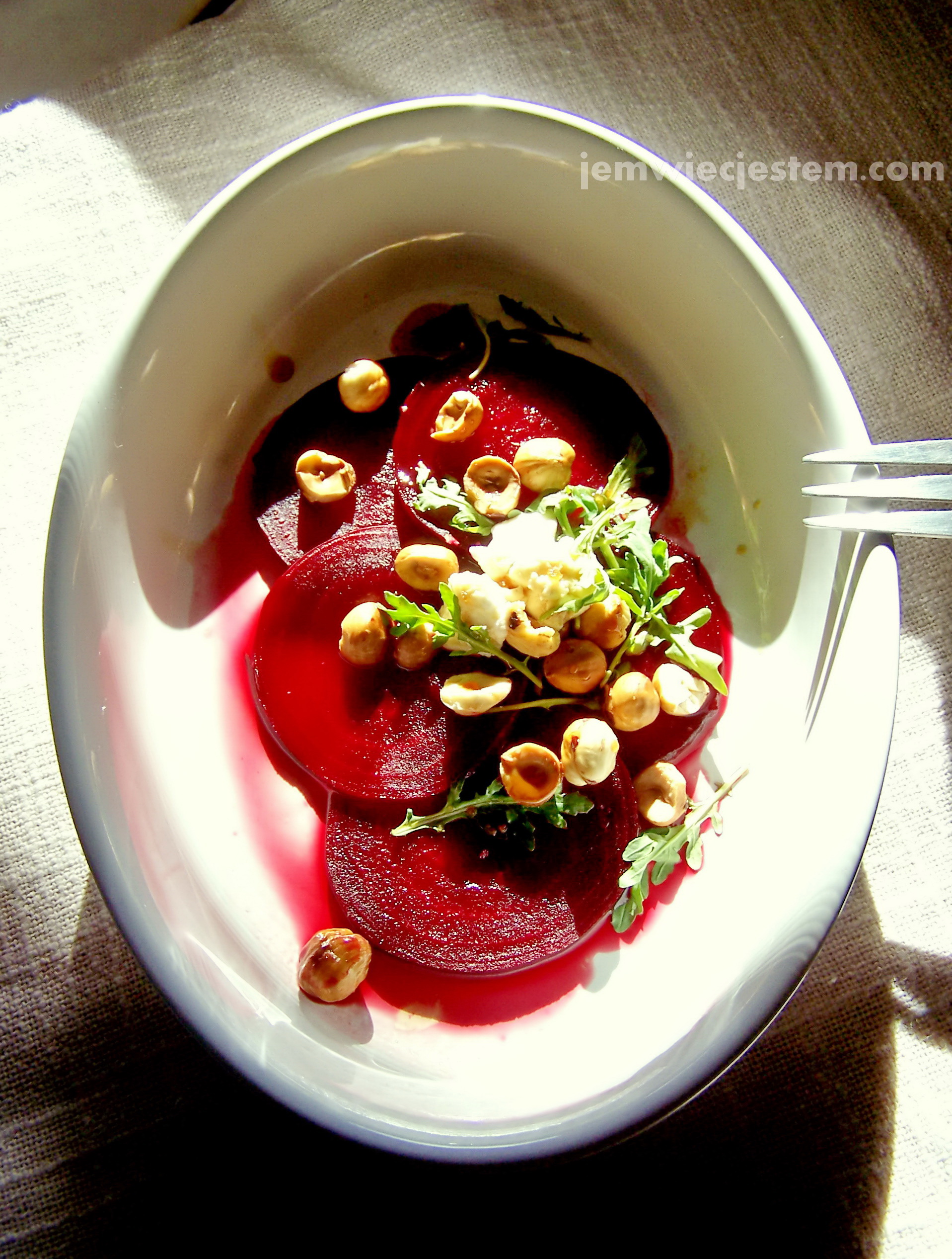 Kiedy myślałam o sałatce buraczanej, przypomniało mi się, że jesień w Polsce była porą łuskania orzechów, a właśnie dziś przywiozłam ze sklepu worek orzechów laskowych. Świetnie więc! Kolejny pomysł na wykorzystanie składnika sezonowego! Połączenie obu produktów wydało mi się jak najbardziej stosowne nie tylko ze względu na sezon, ale również na smak, kontrastową teksturę i kolorystykę.