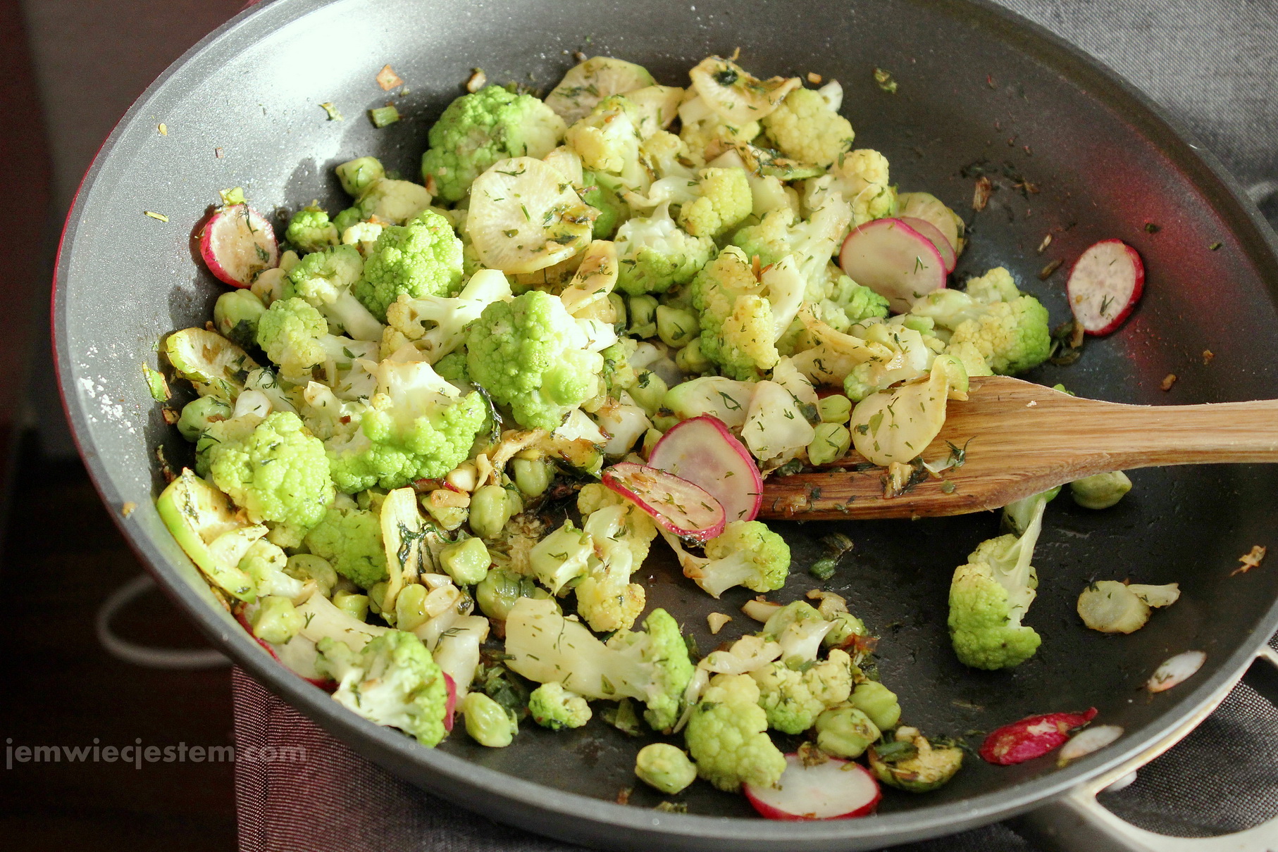 - Dodać do pateni z ziołami rzodkiew i rzodkiewkę, smażyć na wysokim ogniu do momentu kiedy zaczną się złocić (uważać, żeby nie przypalić), nastęnie dodać do patelni kalafior, doprawić do smaku solą i doładnie wymieszać wszystkie składniki; smażyć przez kolejne 5 minut.