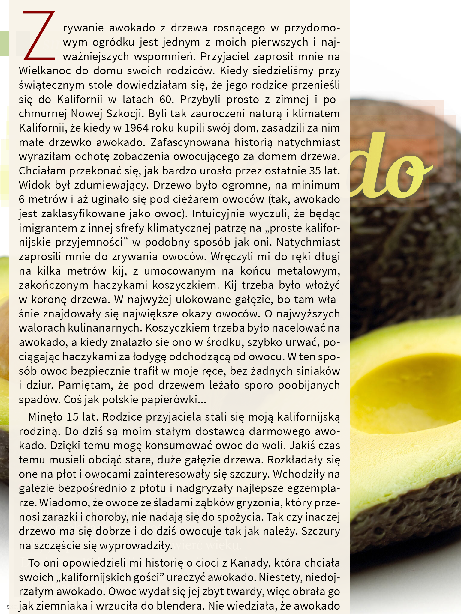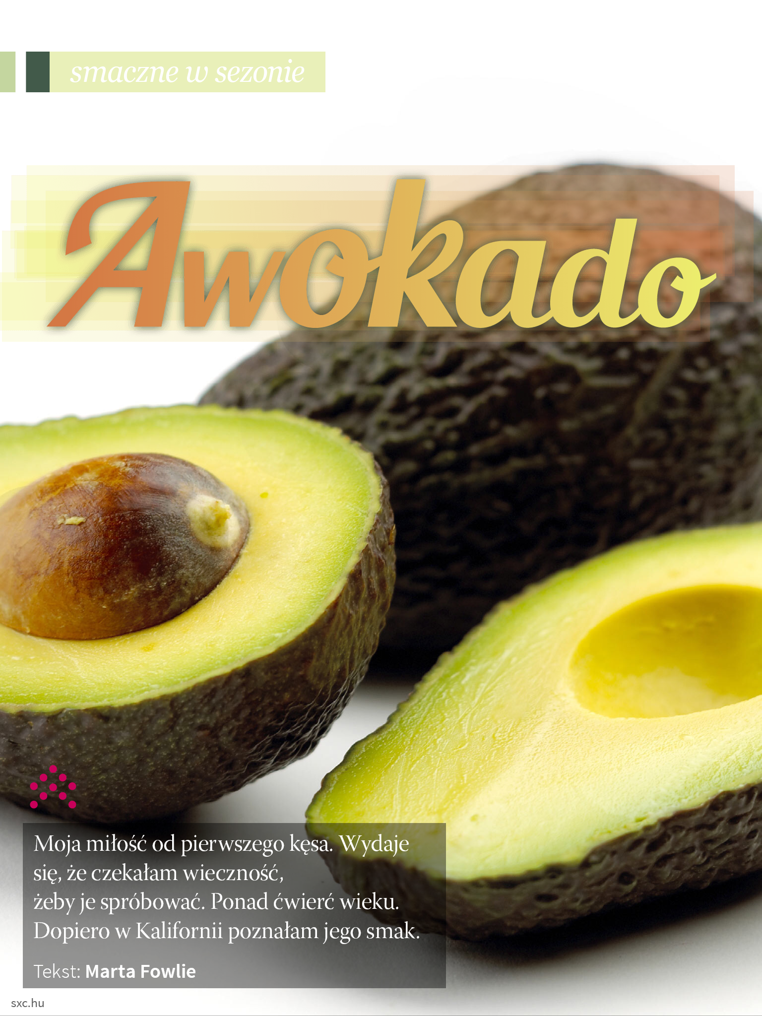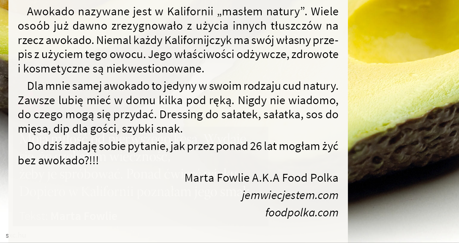 Dla wrześniowego numeru Magazynu SMAQ (wrzesień 2014) przygotowałam felieton o awokado oraz serię autorskich przepisów z użyciem tego owocu. Dziś na łamach mojego blogu reedytuję felieton.