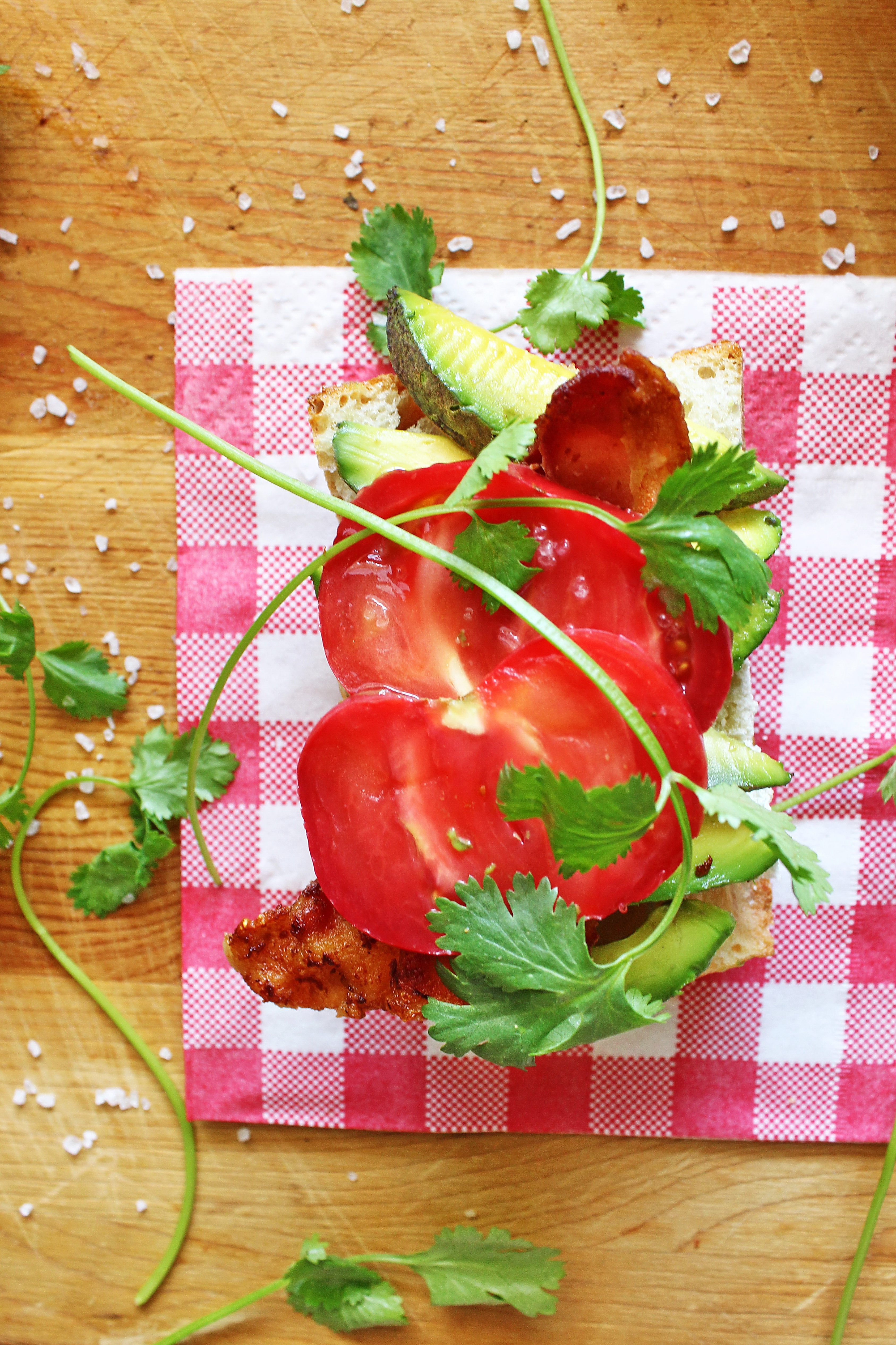 5. Na każdą kromkę chleba nałożyć po równej ilości plasterków awokado, następnie nałożyć boczek, pomidory, kolendrę i poprószyć solą (kanapki można przeciąć na pół; podawać złożone lub otwarte).