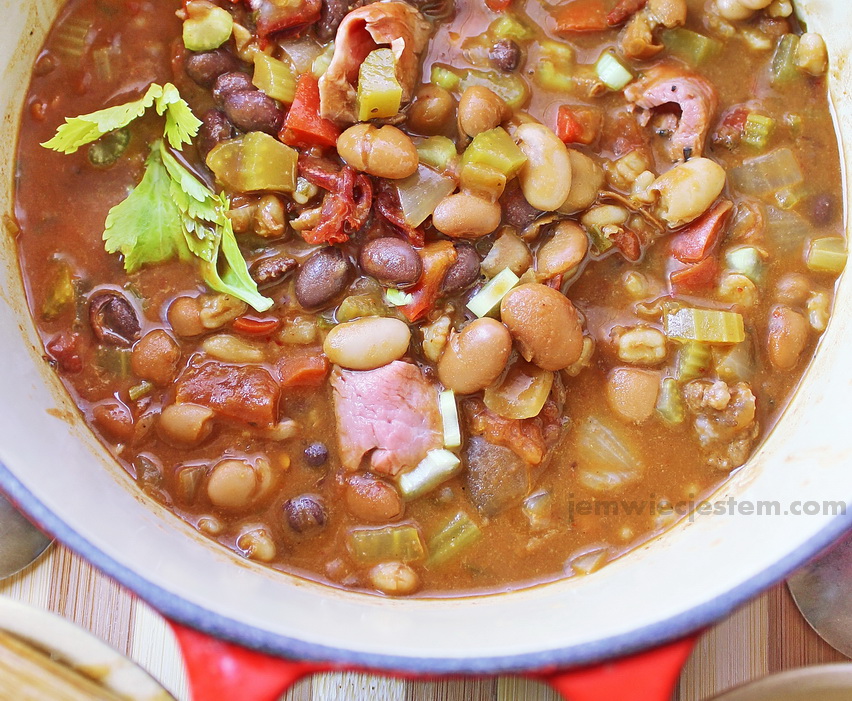 Ile domostw w USA tyle przepisów na chilli. Jej integralną częścia jest fasola, choć w niektórych regionach chili to tylko sos z mięsem. Zima już prawie się kończy, więc dziś podaje przepis na chili z czterech gatunków fasoli. Przystosowałam go do fasoli, które są bardziej powszechne w Polsce. Dodatek chipotle chili nadaje temu konkretnemu przepisowi meksykańskiego wpływu. Zapraszam do wypróbowania.