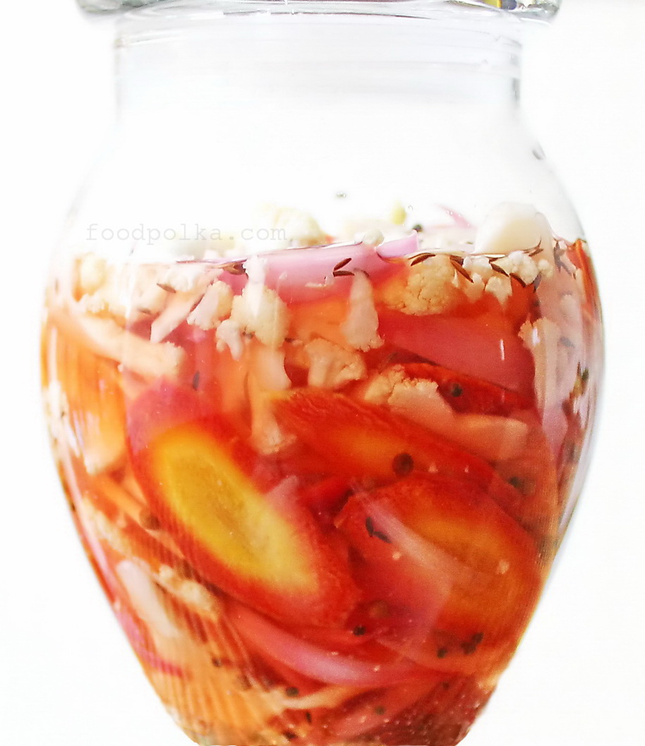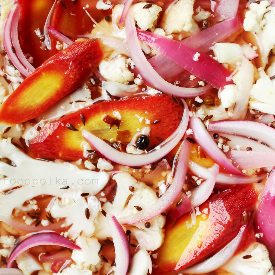 - Równomernie upakować kalafior, cebulę, czosnek, marchew w szklane naczynie, słoik lub pojemnik; zalać warzywa gorącą marynatą (tak żeby była przynajmniej 2 cm ponad warzywami); ostudzić naczynie do temperatury pokojowej, następnie przykryć pokrywką lub zakręcić słoik; przechowywać w lodówce (idelanie zachowują smak 14-30 dni).