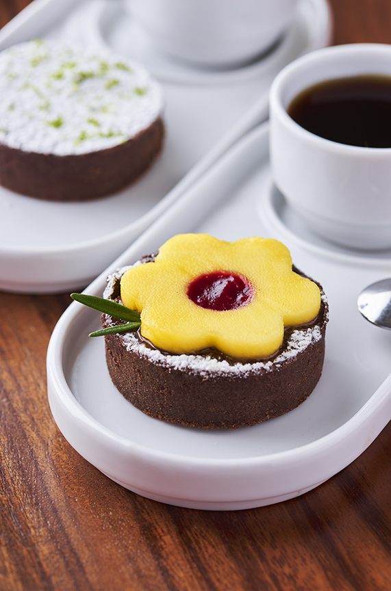 4. Korzystajac z wyciskarki w kształcie kwiatka  delikatnie wyciąć wzór w plastrach mango. Używając drylownicy do jabłek, wyciąć otwór w centrum owocowego kwiatka. Delikatnie umieścić owocowego kwiatka nad warstwą cukru pudru  i udekorować po bokach listkami ziół.