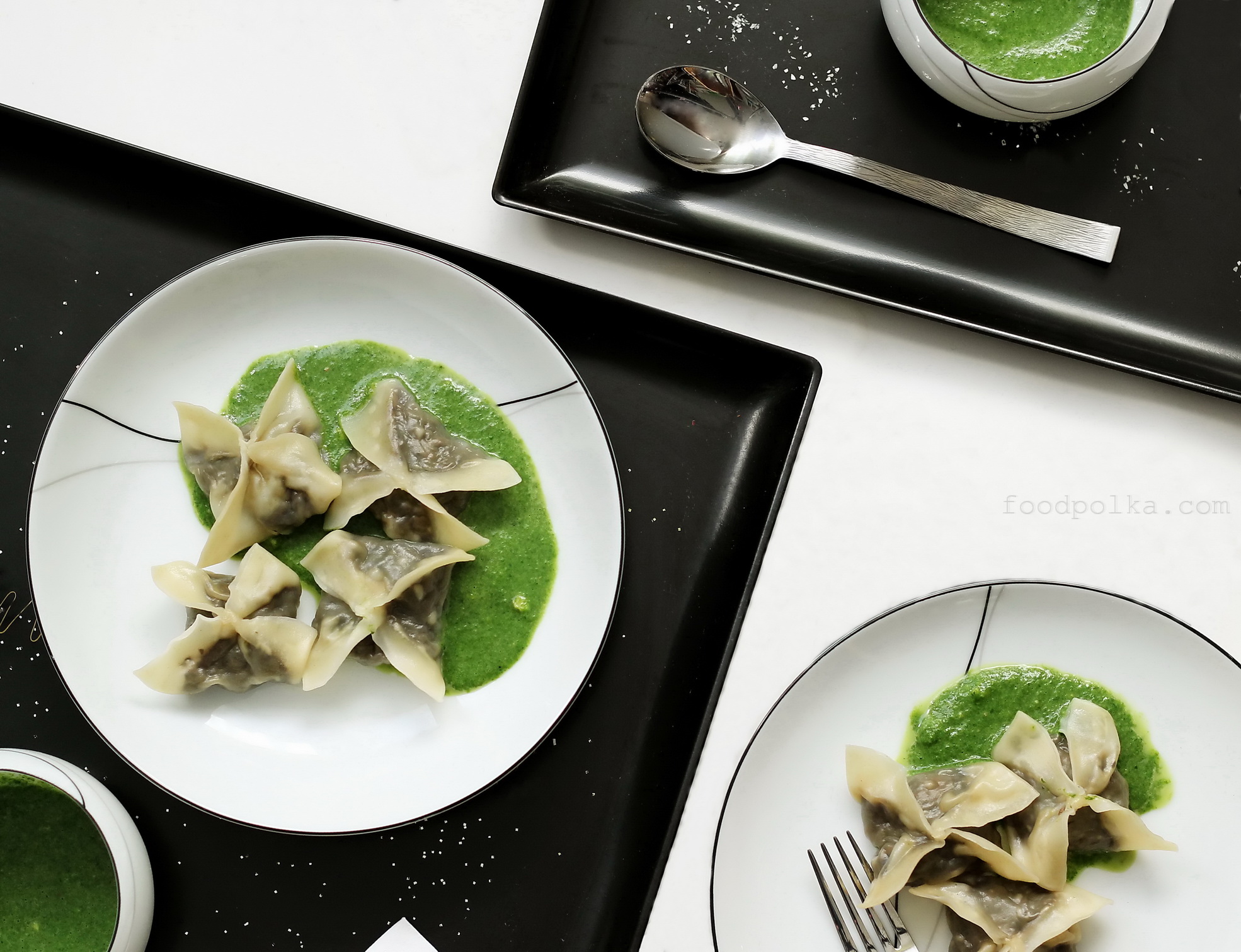Wontonki z grzybami i sosem szpinakowo-czosnkowym
