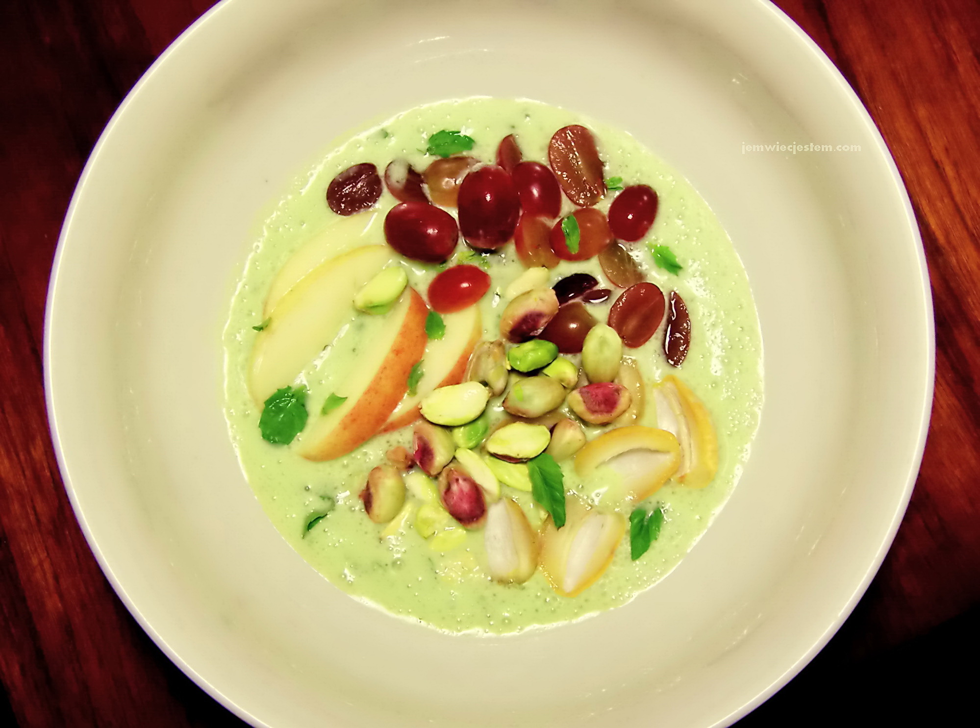I was craving for something sweet. Search thru my fridge and came out with something that could be a modern, healthier version of the 60's classic - the Ambrosia. Coconut milk blended with fresh basil and whipped with yogurt lightly sweetened with honey ; my favorite apple Gala, grapes, fresh dates and fresh pistachios. It was super tasty and refreshing in the same time... Zachciało mi się coś słodkiego więc popatrzyłam co mam w lodówce i zrobiłam nowoczesną i zdrową wersje deseru Ambrozja, klasyku z lat 60-tych. Mleko kokosowe zmieszałam ze świeżą bazylią i ubiłam z naturalnym jogurtem lekko posłodzonym miodem. Dodałam jabłko Gala, winogrona, świeże daktyle i świeże łuskane prosto ze skorupek orzechy pistacjowe. Bardzo pożywne i smakowite...