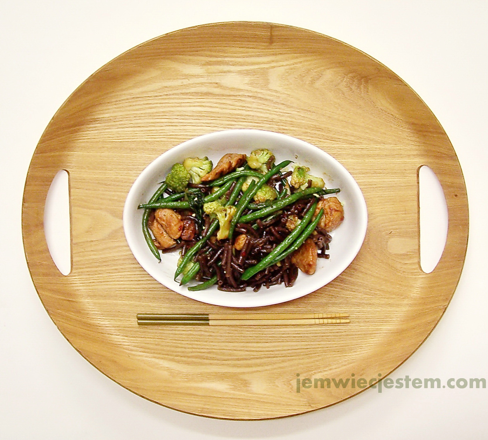 15 minutes dinner idea. Black rice macaroni stir fry with green beans, green cauliflower, bok choy, Sriracha marinated pork sirloin in slightly sweet Tabasco jelly-pepper sauce... Pomysł na szybki obiad w 15 minut. Stir fry z makaronem z czarnego ryżu, zieloną fasolą, zielonym kalafiorem, bok choy, polędwicą wieprzową marynowaną w Sriracha, w lekko słodkim sosie pieprzowym z Tabasco...