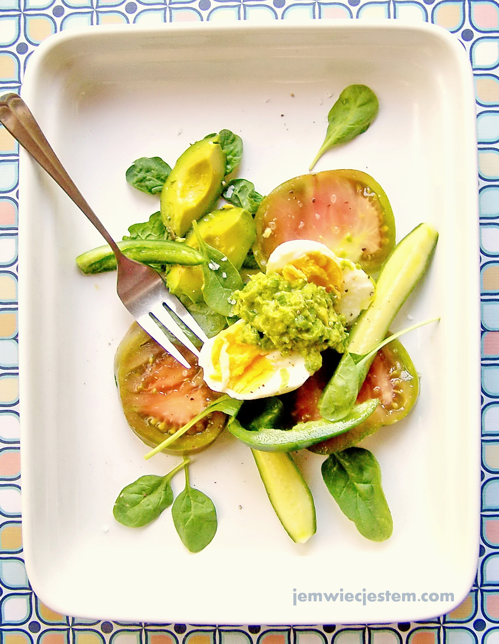 A quick lunch salad idea: baby spinach, tomatoes, avocado, cucumber, jalapeno, hard boiled egg with guacamole as a dressing... Szybki pomysł na sałatkę: szpinak, pomidory, awokado, ogórek, jalapeno, jajko na twardo z dresingiem guacamole...