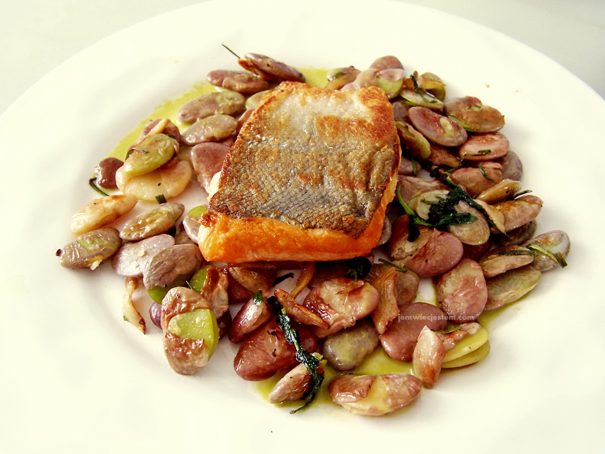 Pan fried, crisp skin Coho Salmon straight from Alaska (thanks again Mario) with fresh Lima beans sauteed with garlic, chive and cilantro... Cgrupiący, smażony na patelni łosoś Coho, prosto z Alaski ze świeżą fasolą Lima satue z czosnkiem, szczypiorem i kolendrą...