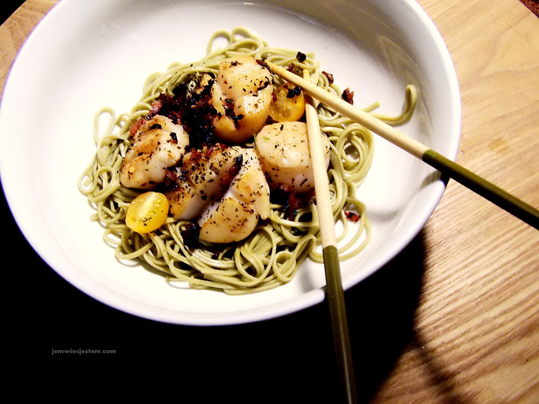 Fresh sea scallops seared with bacon, green tea, Thai chili and green onions; served with green tea Soba noodles... Świeże morskie przegrzebki, paserowane z boczkiem, zieloną herbatą, płatkami tajskiej chili i szczypiorem; z japońskimi kluskami Soba z zielonej herbaty...