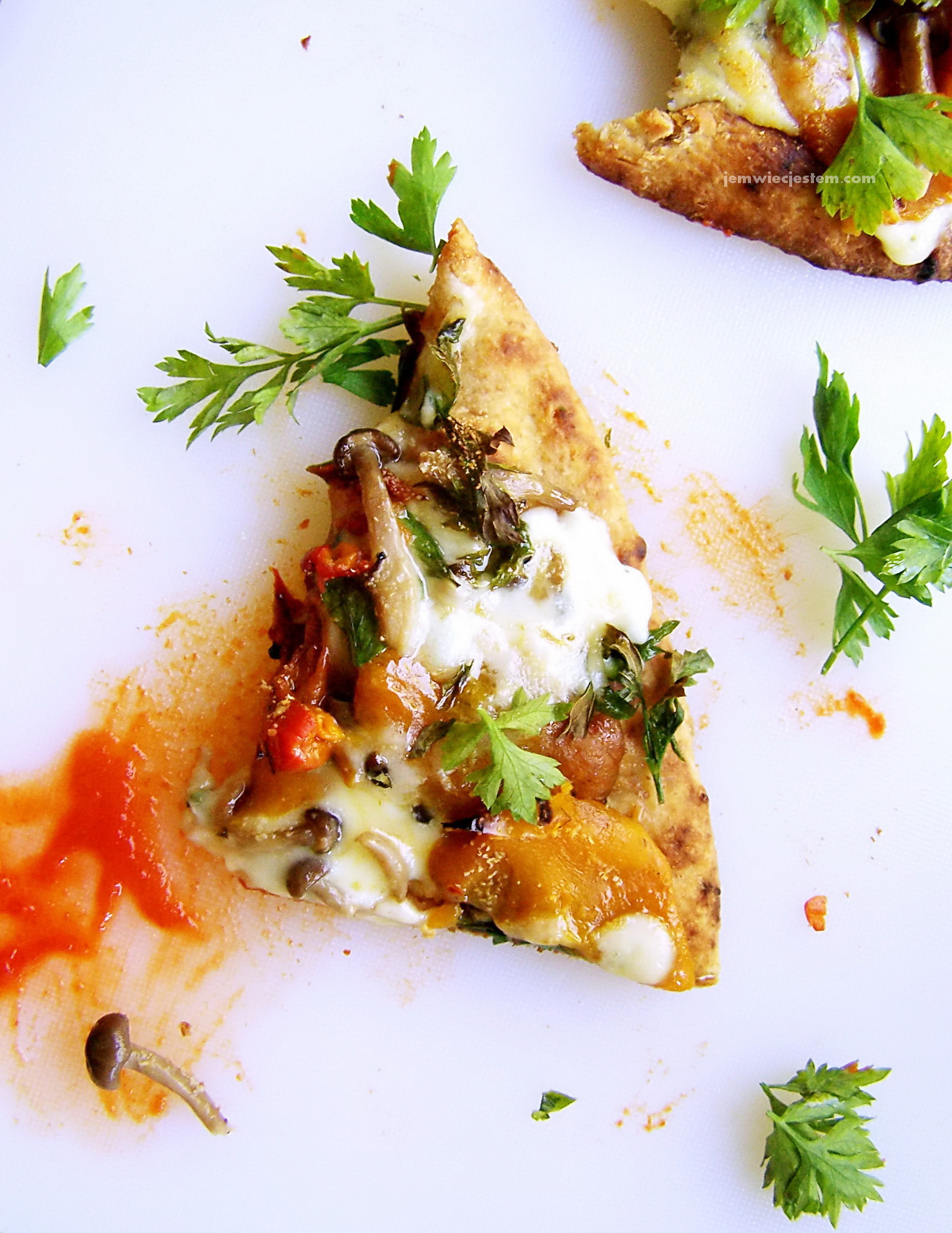 Flatbread with braised brown Shimeji mushroom, roasted bell peppers, parsley and Fontina cheese, dipped in Sriracha... Yum... Chleb z duszonymi grzybami Shimeji, grilowanymi paprykami, natką pietruszki i serem Fontina; maczany w sosie Sriracha... Pycha!