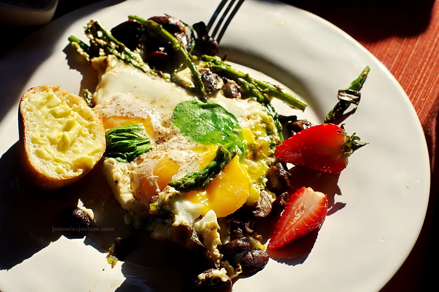 Breakfast in the sun: runny eggs, asparagus, Crimini mushroom and spinach... Śniadanie w słońcu: jajka, szparagi, grzyby Crimini i szpinak...
