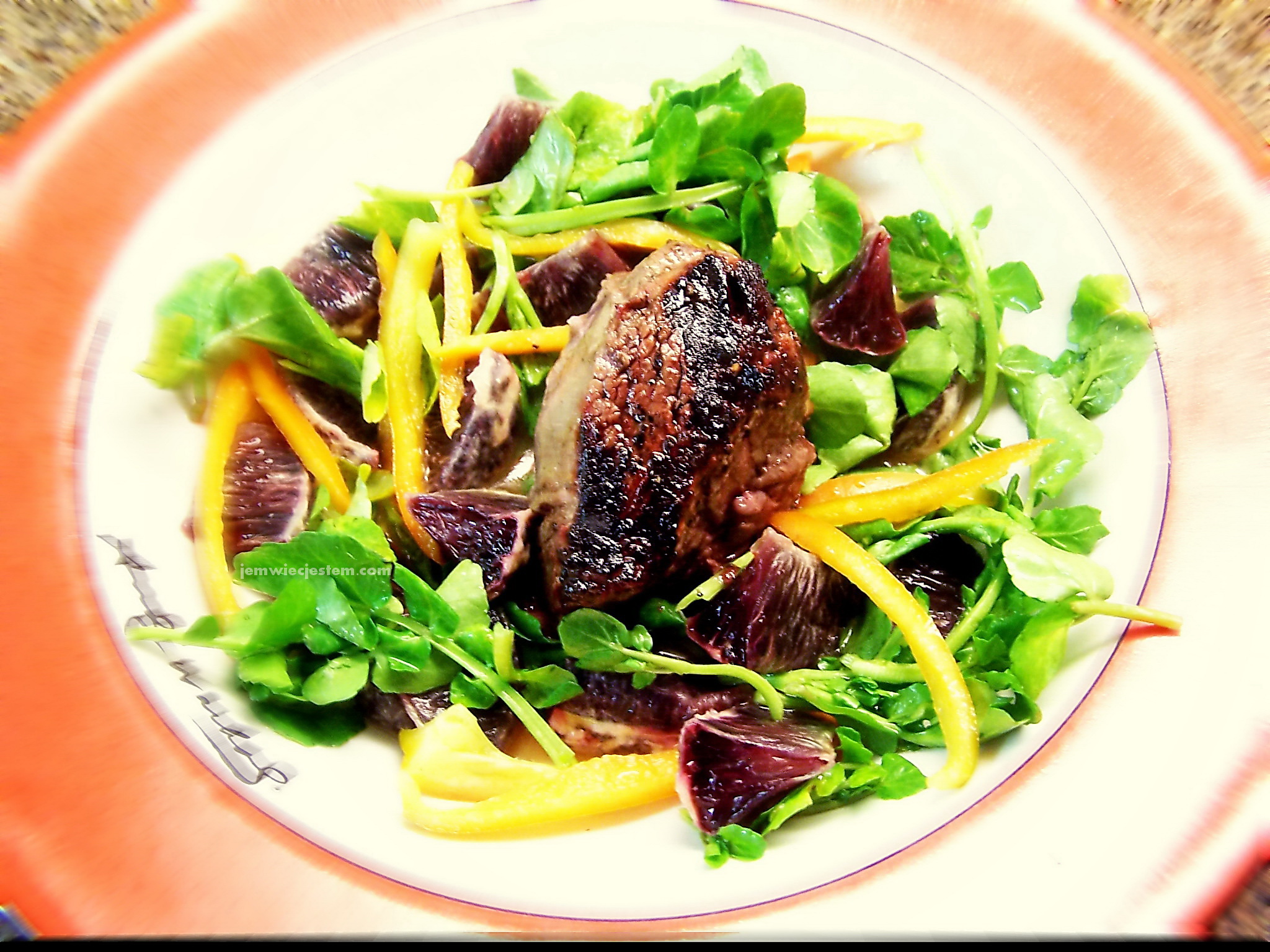 Grilled fillet mignon on the watercress-blood orange-bell pepper salad in orange-rice vinegar dressing... Grilowany stek fillet mignon z sałatką z rukwii wodnej z krwistą pomarańczą, papryką...