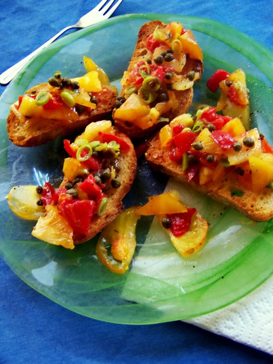 Szybkie tosty crostini z kolorowymi pomidorami, kaparami i czosnkiem